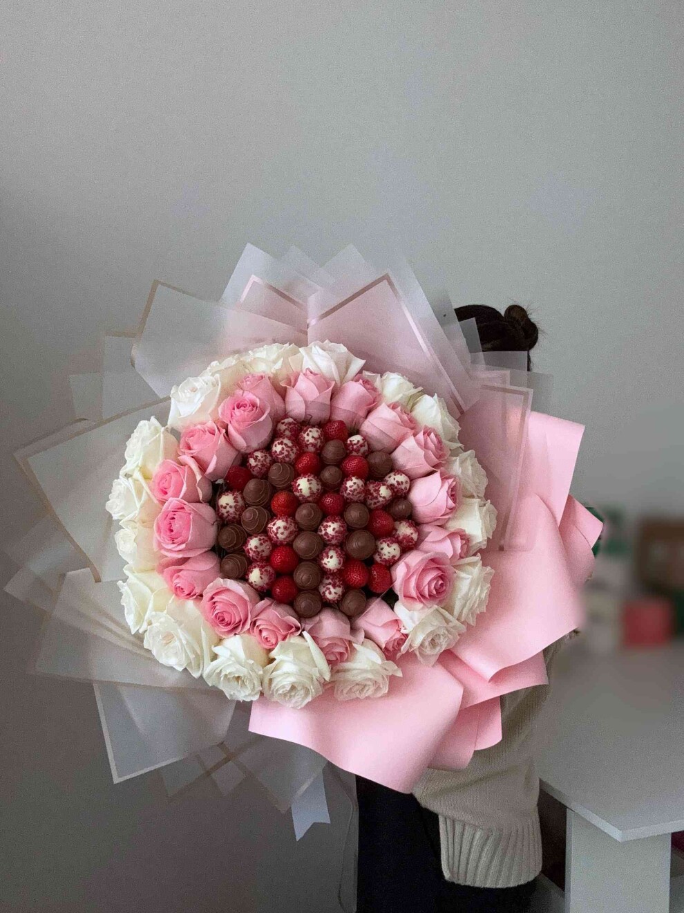 Размер XXL: ширина 60 см, высота 60 см. Возможно исполнение букета в размерах S, М, L. Стоимость букета зависит от размера.