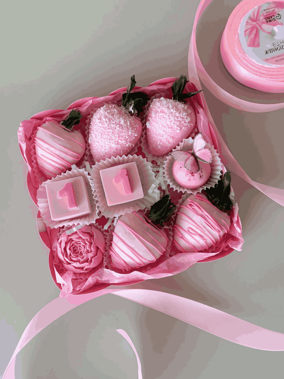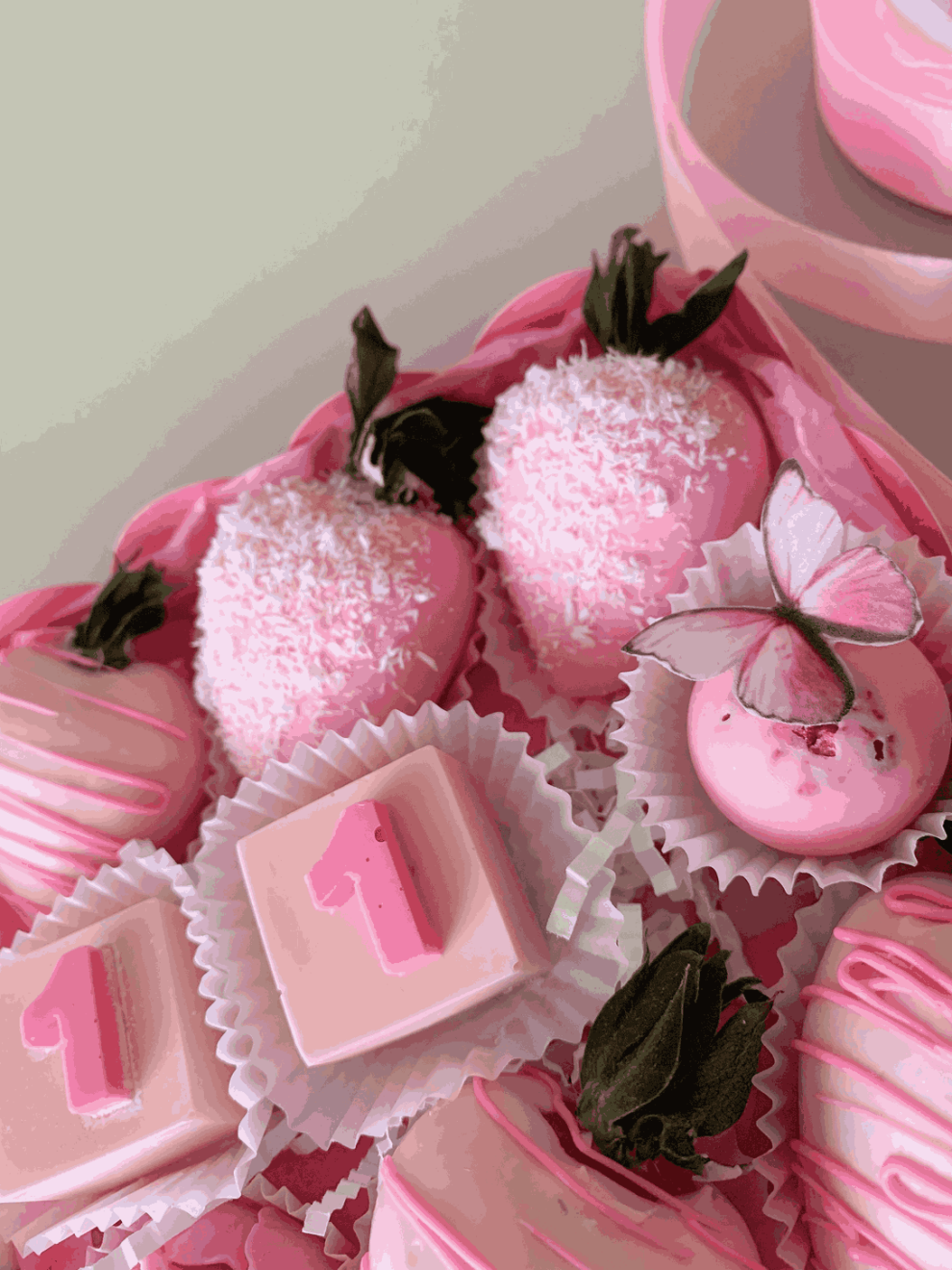 - клубника в шоколаде 5 шт., декорированная кокосом, фигурки-цифры "число лет", сфера с малиной и миндалем, цветок из бельгийского шоколада
