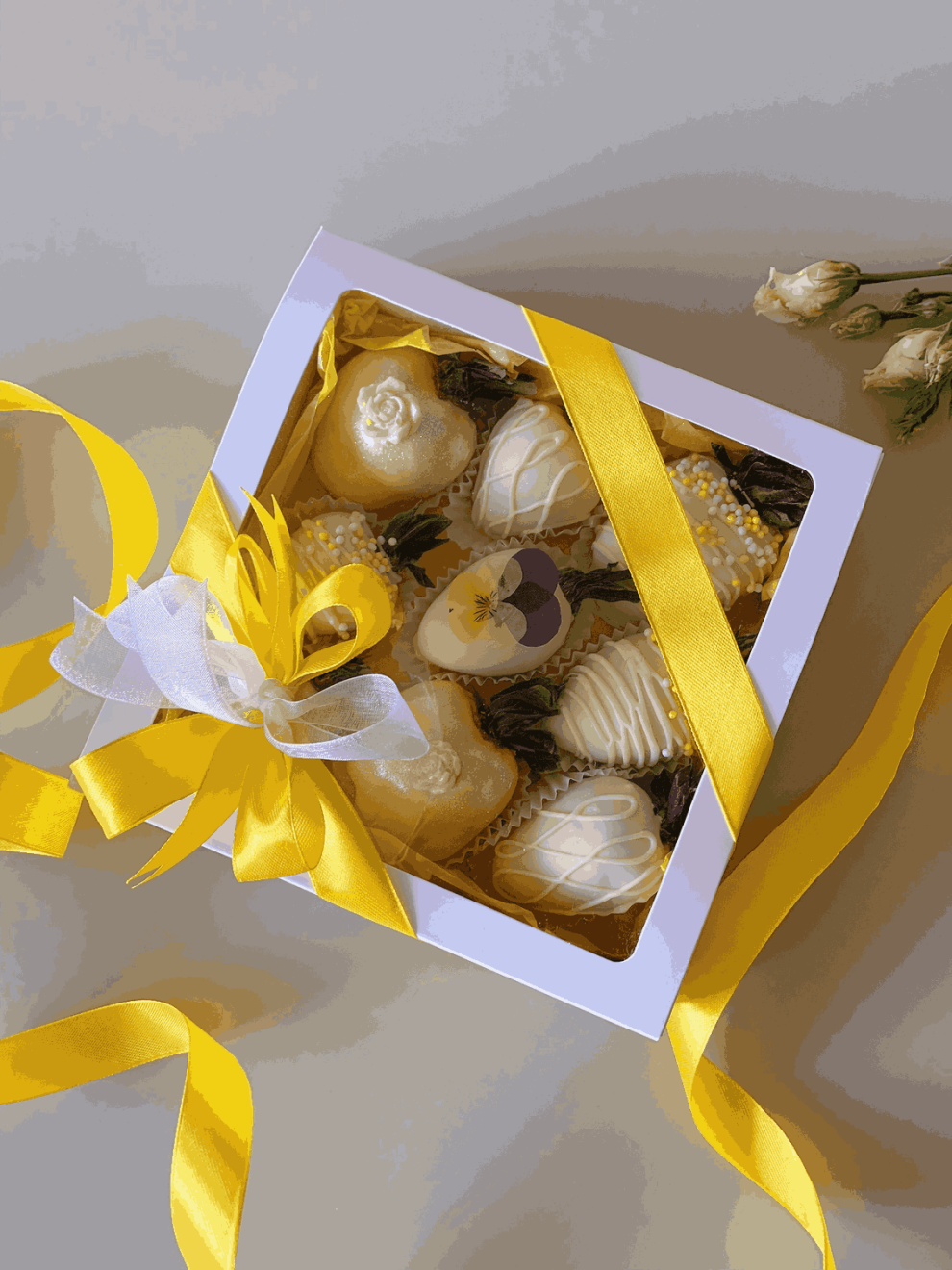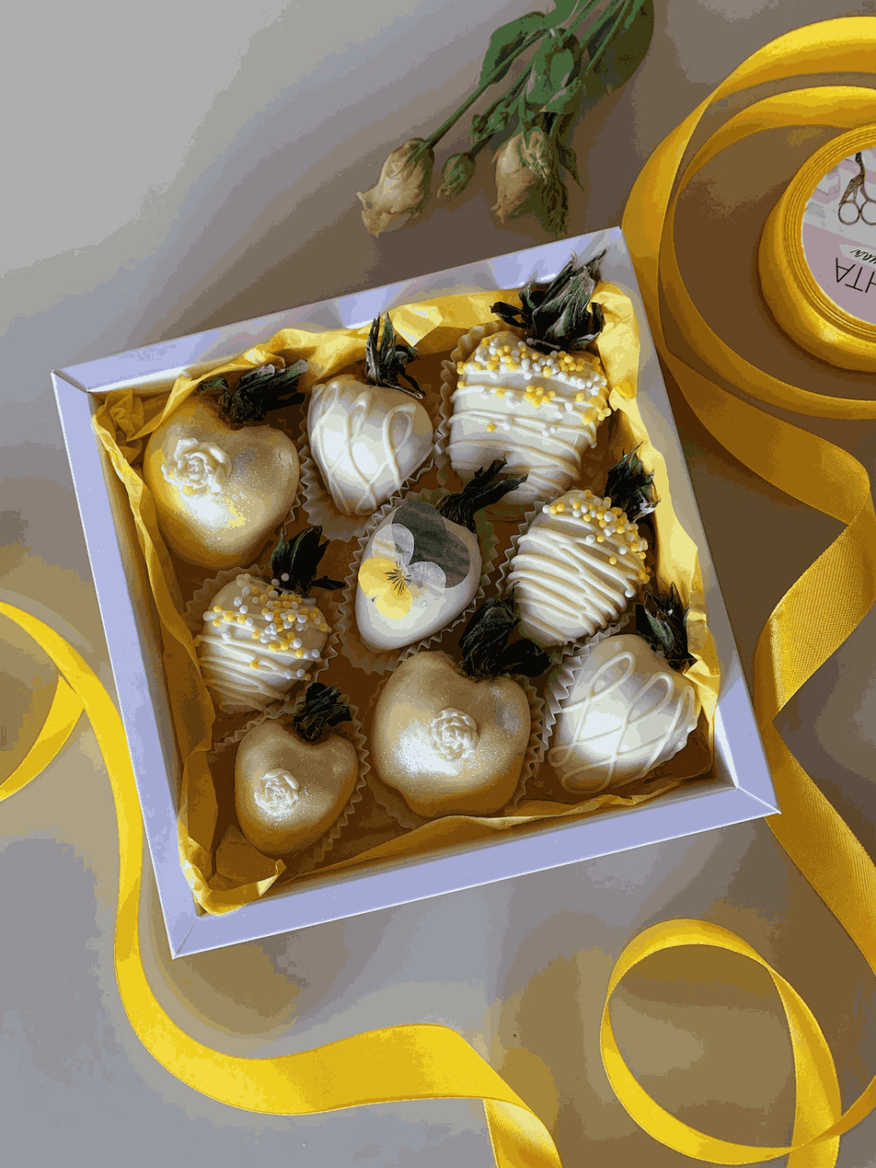 - клубника в шоколаде 9 шт., декорированная воздушным рисом, сублимированными съедобными цветами